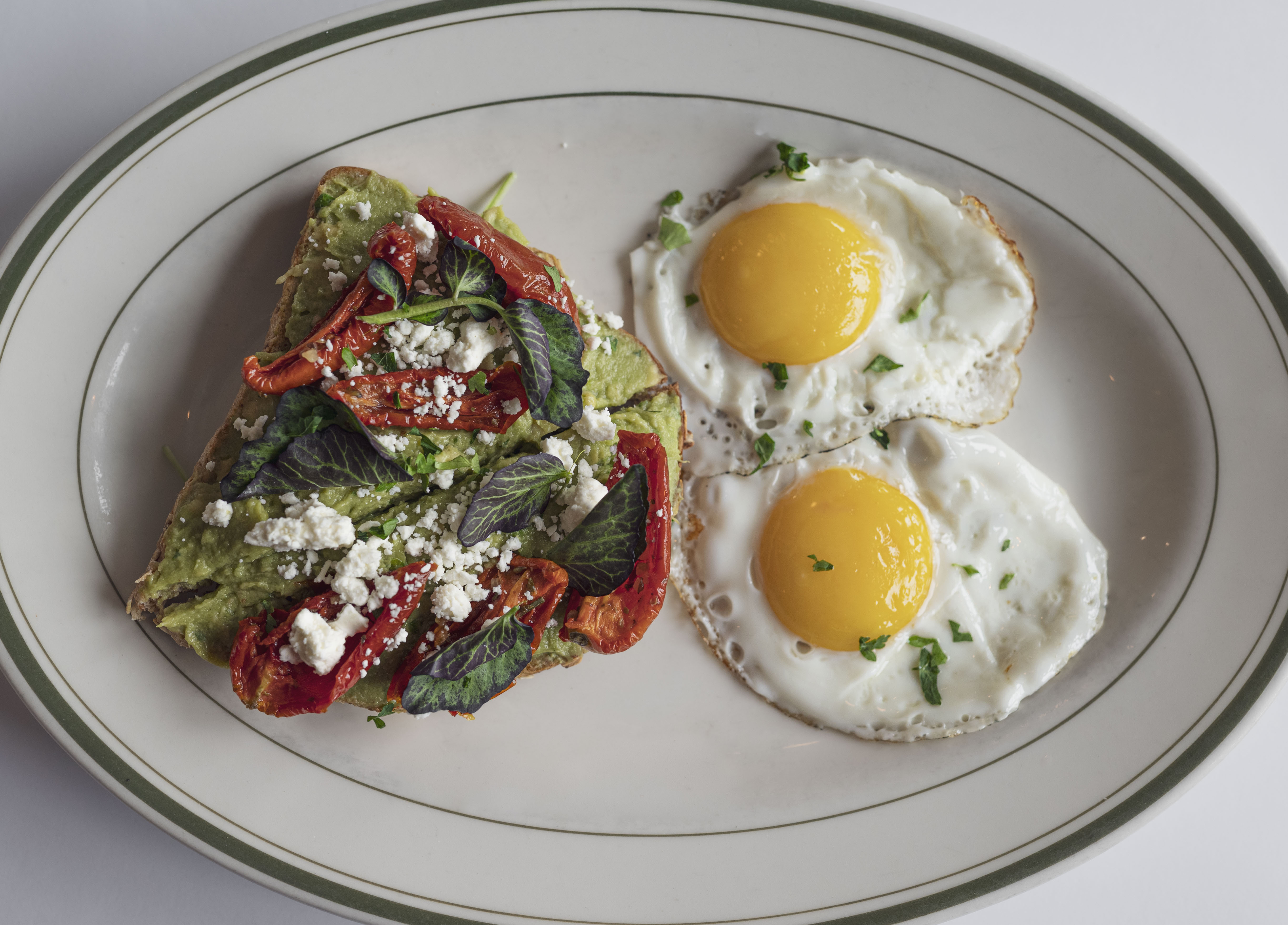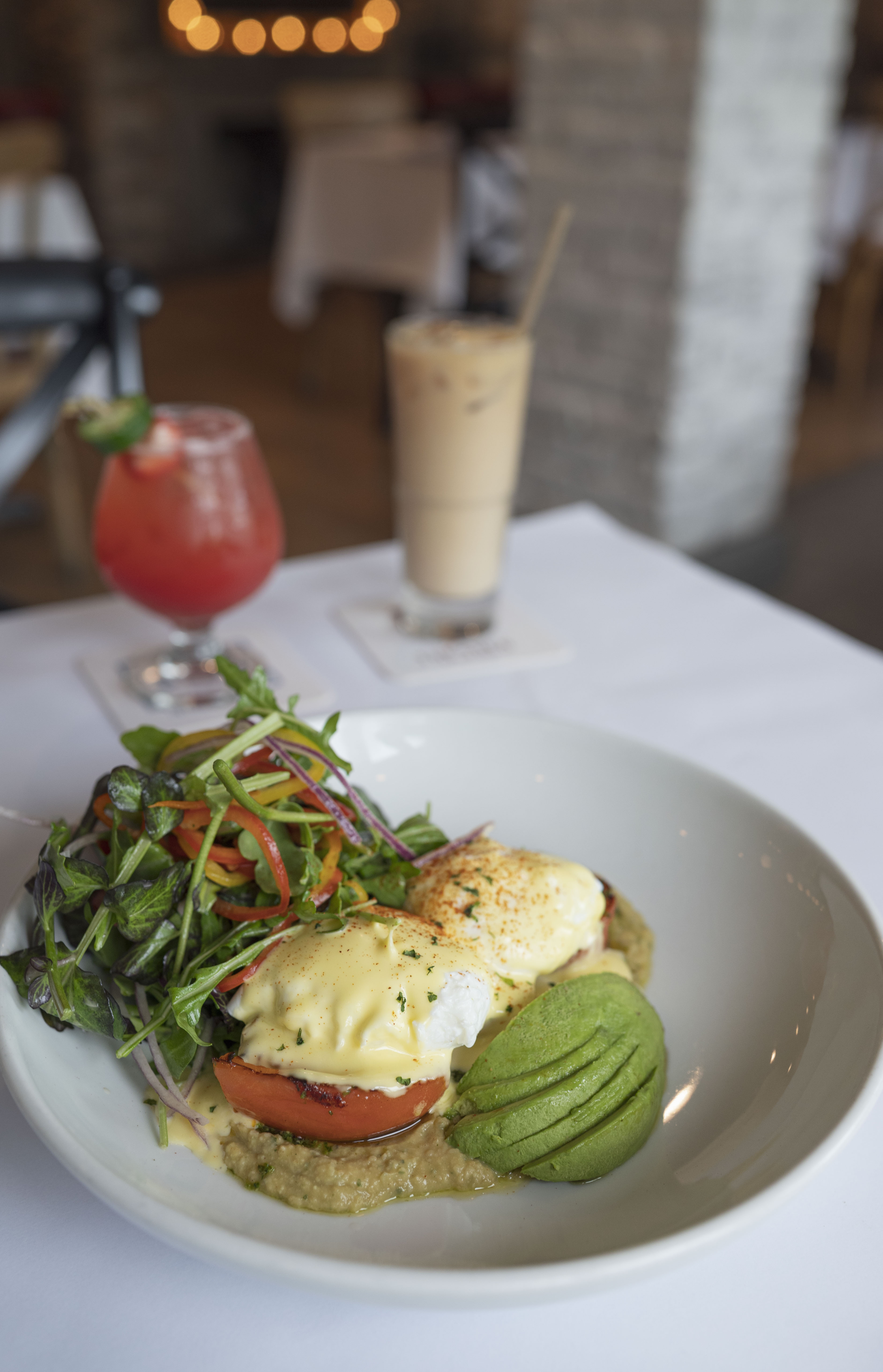 Grilled Tomato, Avocado, 2 Eggs Poached*, Hollandaise, Basil Hummus, Arugula Salad (GF)