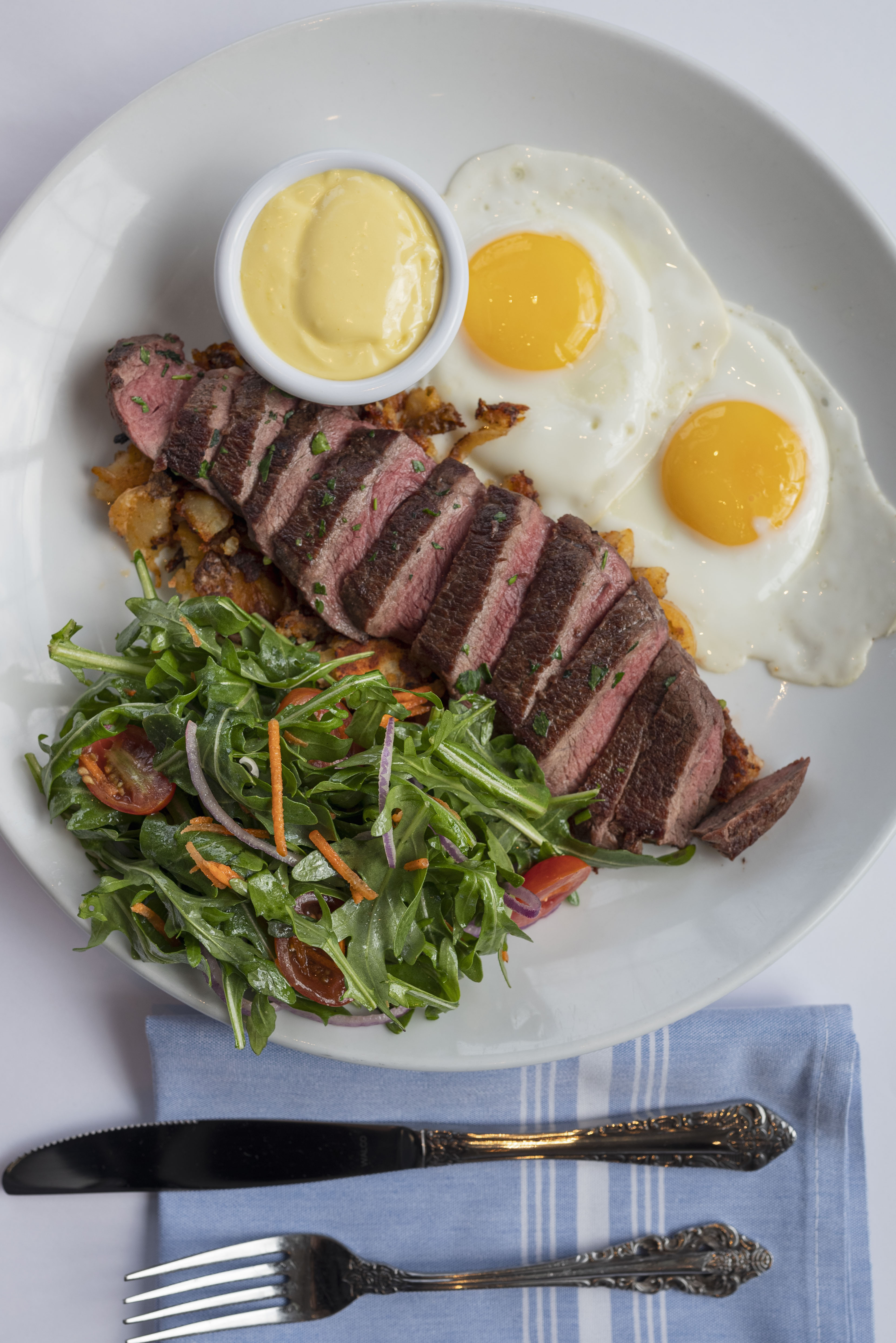Sirloin Steak, 2 Eggs Any Style, Homefries, Hollandaise, Dressed Greens (GF)