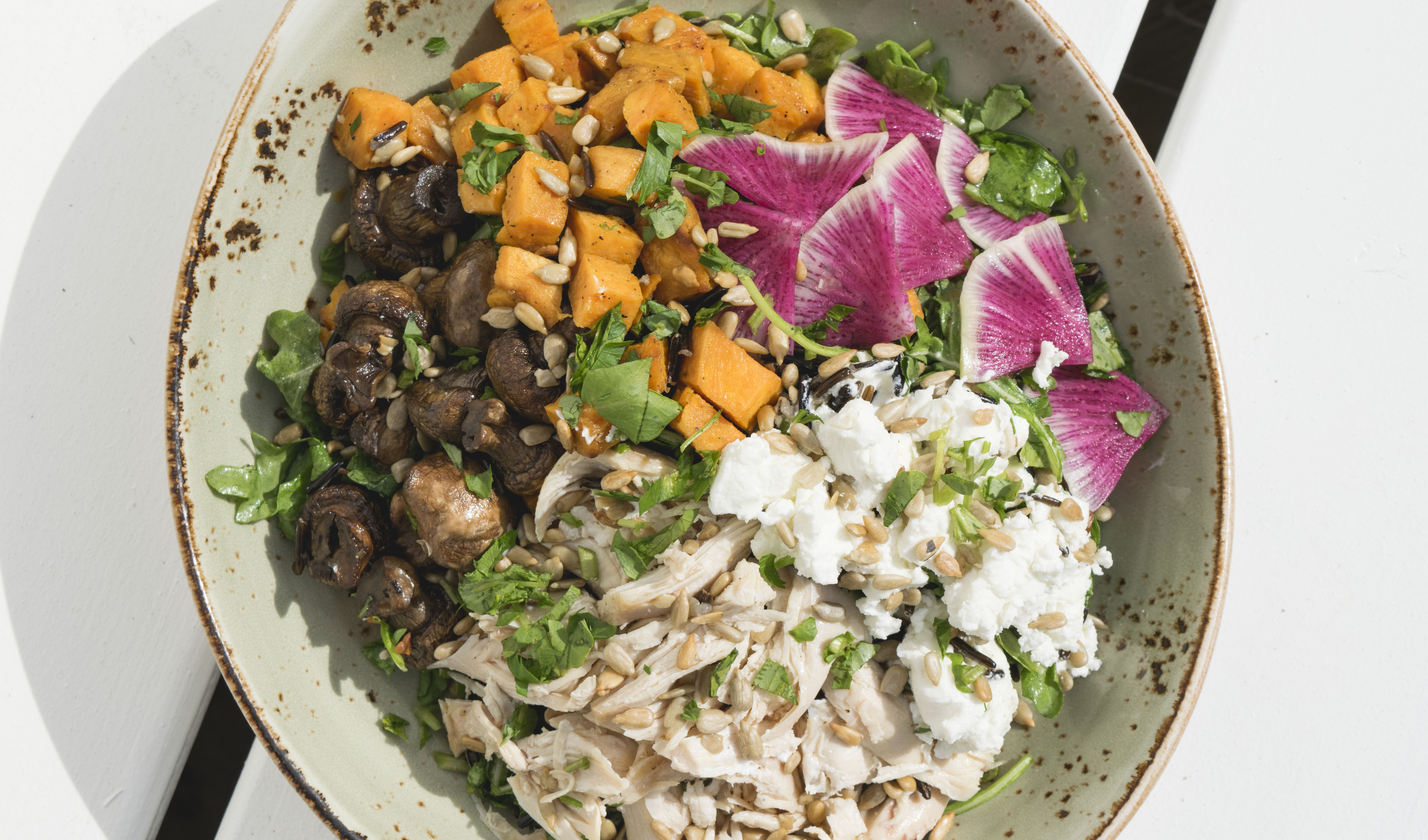 Roasted Chicken, Arugula, Sweet Potato, Mushrooms, Radish, Goat Cheese, Sunflower Seeds, Wild Rice, Spiced Honey Vinaigrette (GF)