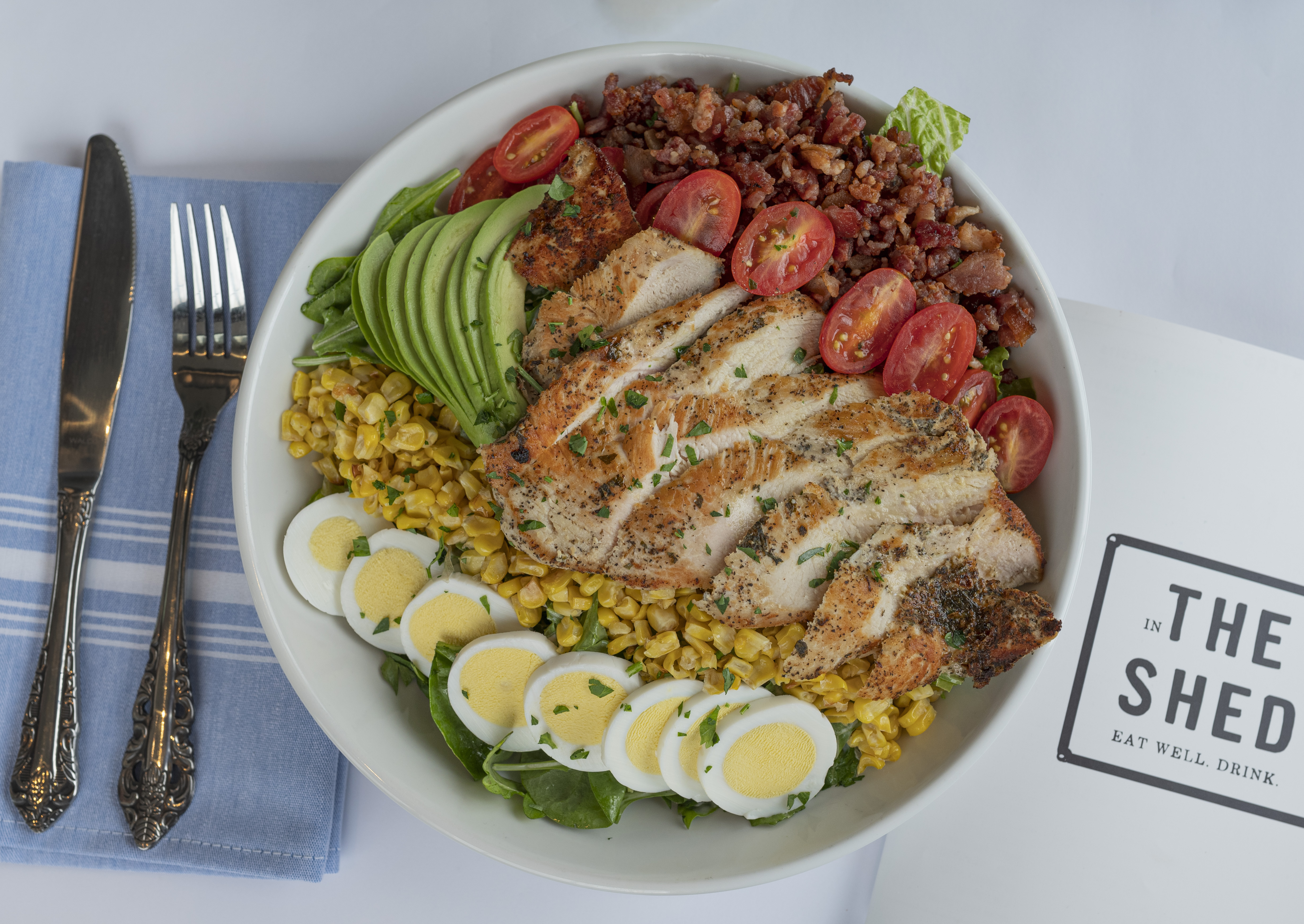 Grilled Chicken, Egg, Bacon, Bleu Cheese, Tomato, Cucumber, Corn, Avocado, Greens, Buttermilk Dressing (GF)