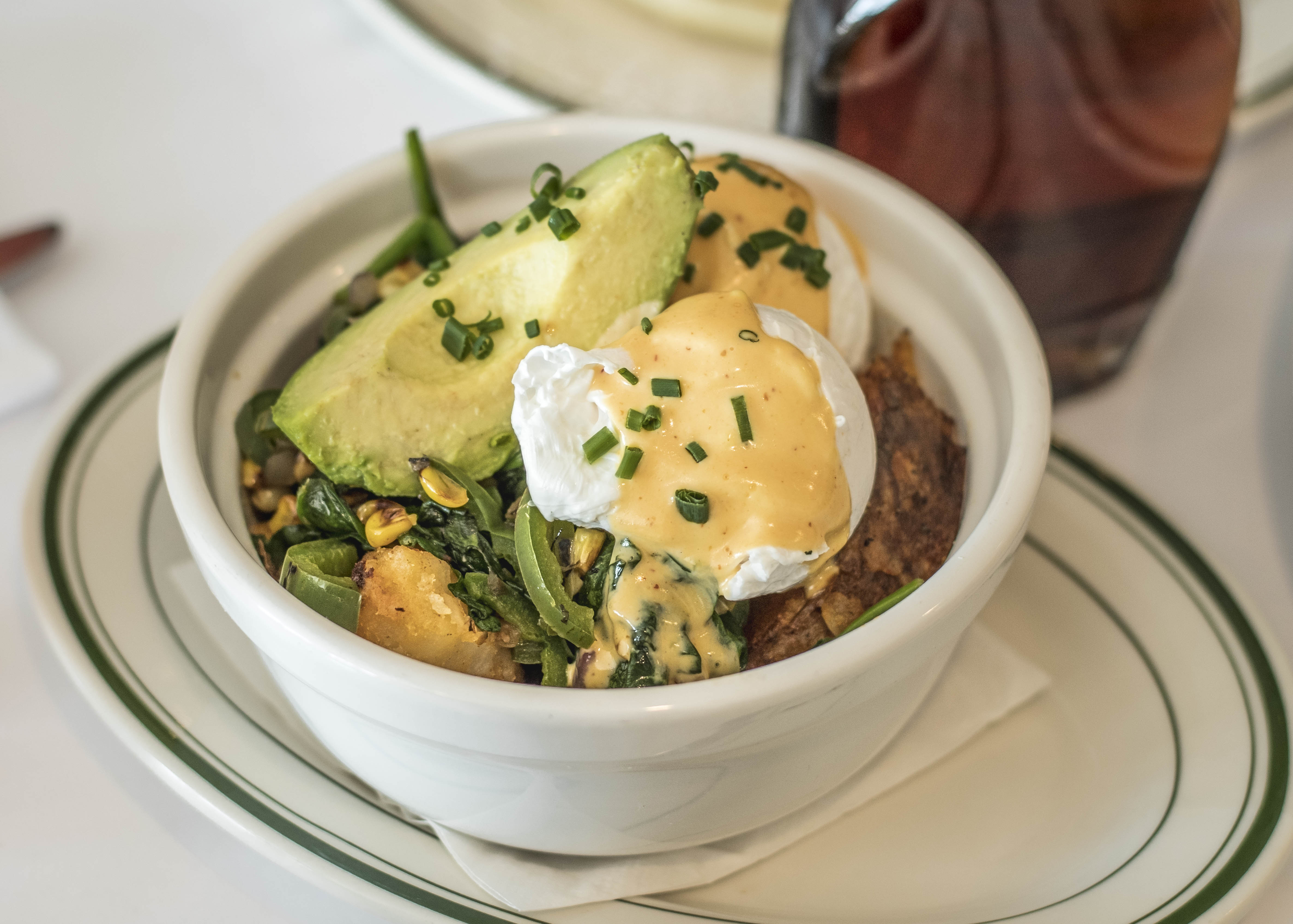 2 Eggs Any Style, Avocado, Homefries, Spinach, Onion, Corn, Jalapeno, Chipotle Hollandaise (GF)